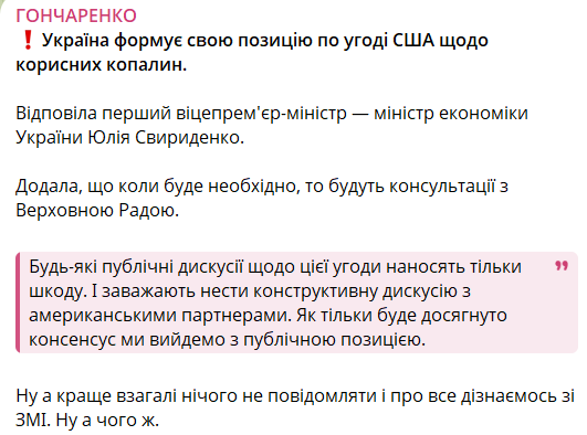 Правительство Украины подтвердило, что получило от США новый проект соглашения о полезных ископаемых. Об этом сообщил народный депутат Алексей Гончаренко со ссылкой на выступление в парламенте вице-премьера Юлии Свириденко.