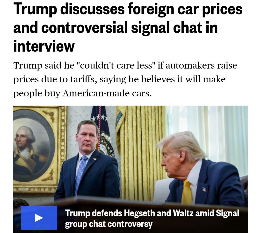 Он отметил, что не сомневается в советнике по национальной безопасности Майке Уолтце и главе Пентагона Пите Хегсете. Также президент США добавил, что "никогда не слышал", чтобы велись разговоры об увольнении первого, подчеркнув, что подобное решение может принять только он.