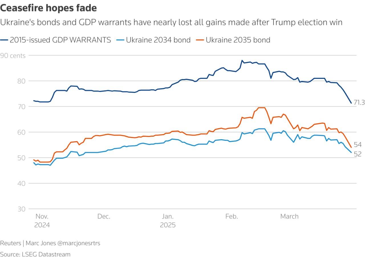 Украинские облигации рекордно упали из-за скепсиса по поводу заключения мирного соглашения - Reuters