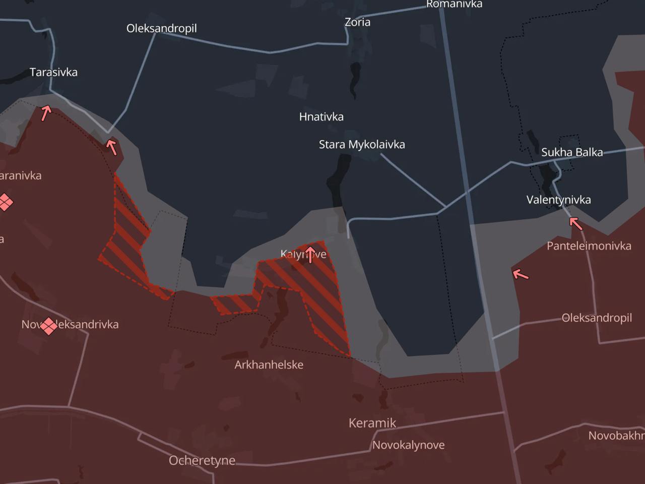 08:50 Российские войска за минувшие сутки снова продвинулись на участке фронта между Покровском и Торецком - в районе Калинового.