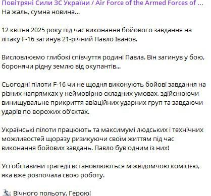 14:12 Сегодня во время выполнения боевого задания на самолете F-16 погиб 21-летний летчик Павел Иванов, сообщают Воздушные силы ВСУ.