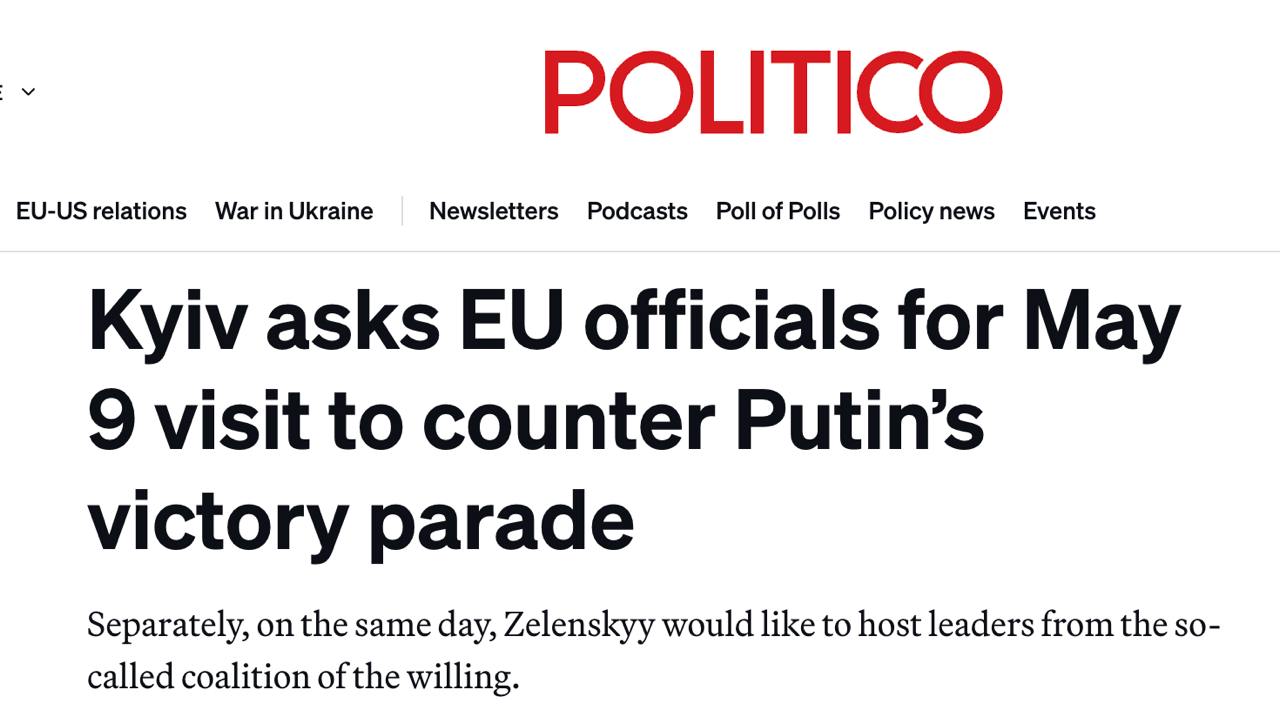 Между тем Politico пишет, что Украина приглашает чиновников ЕС на 9 мая в Киев, чтобы противостоять параду победы Владимира Путина. По данным издания, сегодня глава украинского МИД Андрей Сибига передал приглашение своим европейским коллегам на встрече в Люксембурге.