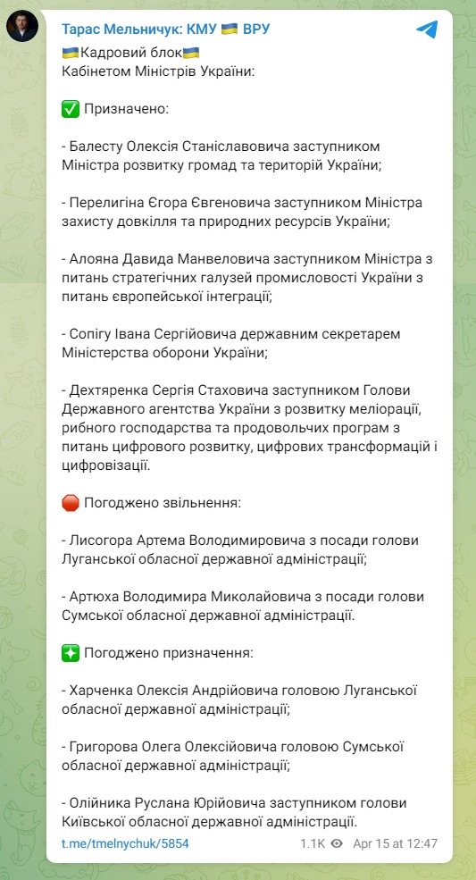 Об увольнении сообщил в своем телеграм-канале представитель правительства в Верховной Раде Тарас Мельничук.