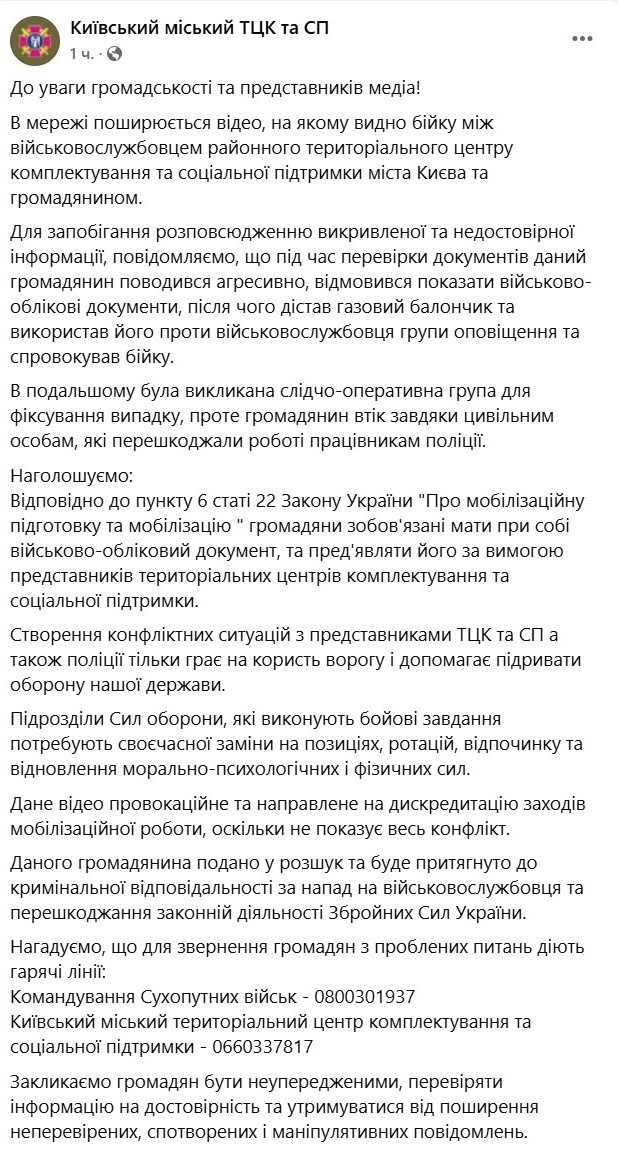 Данный гражданин подан в розыск и будет привлечен к уголовной ответственности за нападение на военнослужащего и препятствование законной деятельности Вооруженных Сил Украины, пишет ТЦК.