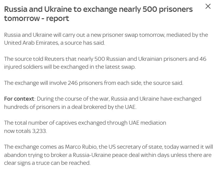 По данным источника издания, при посредничестве ОАЭ завтра каждая сторона передаст по 246 пленных, включая 46 раненых.