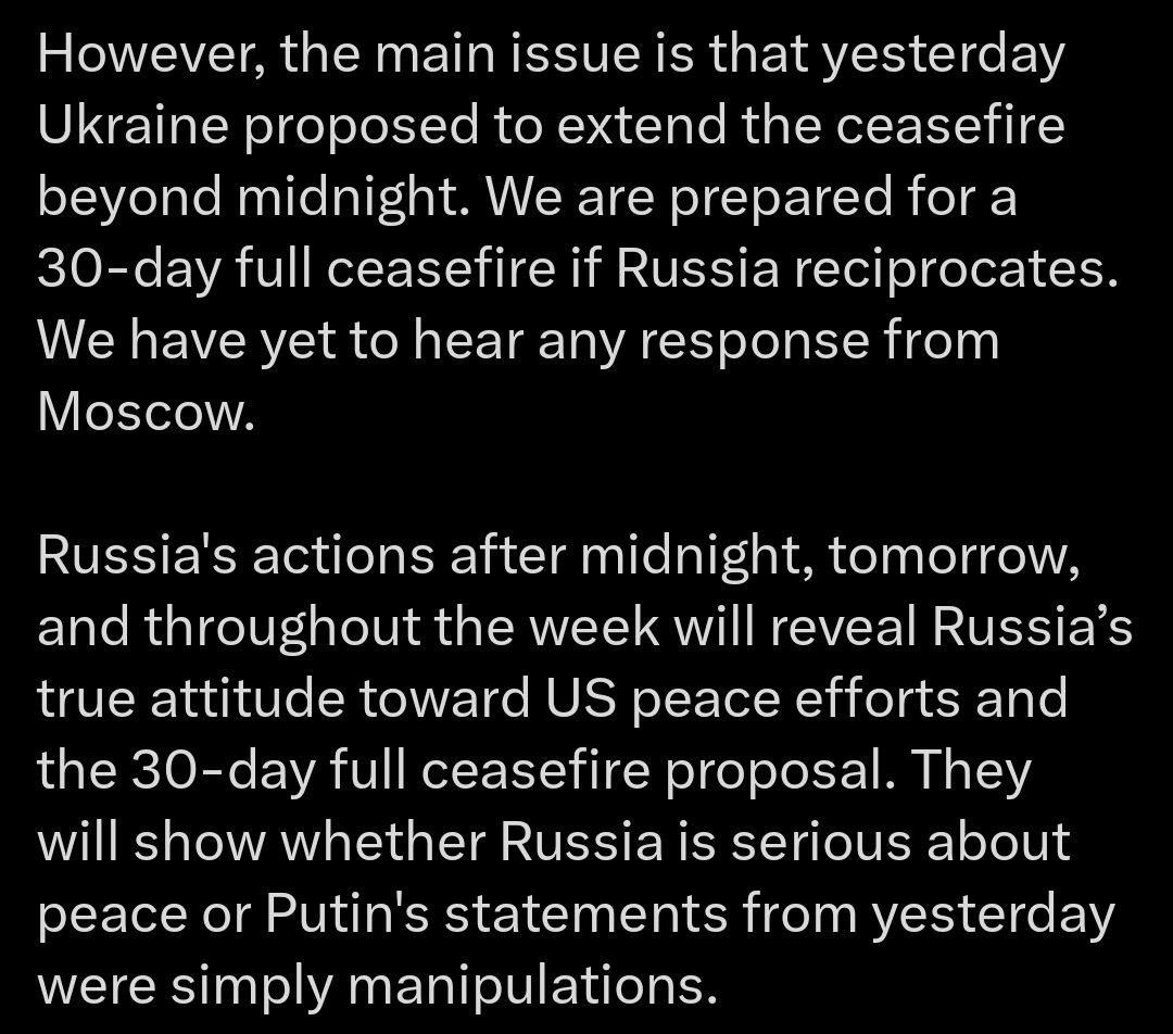 "О перемирии глава государства объявил на встрече с начальником Генштаба Валерием Герасимовым. Режим прекращения огня действует с 18:00 мск 19 апреля до 00:00 мск 21 апреля – суммарно 30 часов. Других указаний не было", – ответил пресс-секретарь на вопрос, будет ли режим прекращения огня завершён в ночь на 21 апреля или может быть продлён на какой-либо срок.