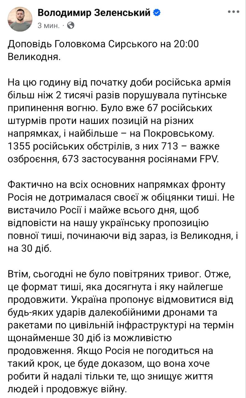 "Тем не менее, сегодня не было ни одной воздушной тревоги. Это тот формат тишины, который уже достигнут и который проще всего продлить. Украина предлагает отказаться от любых ударов дальнобойными дронами и ракетами по гражданской инфраструктуре на срок не менее 30 суток с возможностью продления", – написал президент Украины.