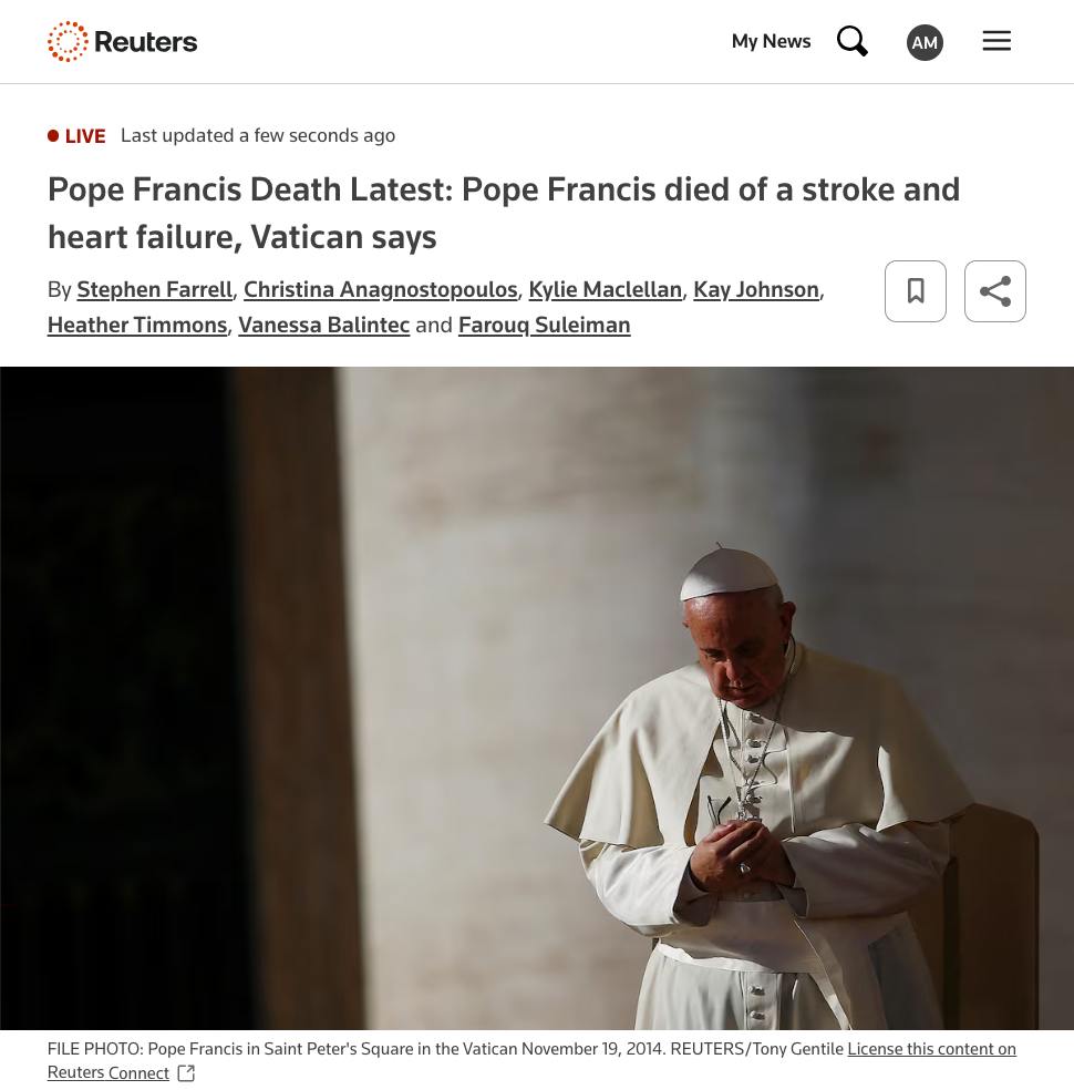 Напомним, папа римский Франциск умер сегодня утром. Ему было 88 лет.