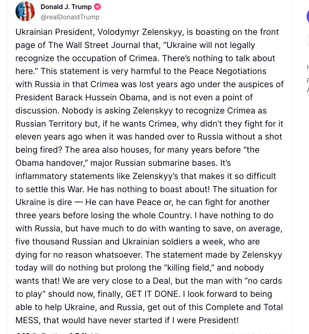 "Президент Украины Владимир Зеленский хвастается на первой полосе The Wall Street Journal, что «Украина юридически не признает оккупацию Крыма. Здесь не о чем говорить». Это заявление очень вредно для мирных переговоров с Россией, поскольку Крым был потерян много лет назад под эгидой президента Барака Хусейна Обамы, и даже не является предметом обсуждения. Никто не просит Зеленского признать Крым российской территорией, но если он хочет Крым, то почему они не боролись за него одиннадцать лет назад, когда он был передан России без единого выстрела? В этом районе также в течение многих лет до «передачи Обамы» находились крупные базы российских подводных лодок. Именно подстрекательские заявления, подобные заявлениям Зеленского, так затрудняют урегулирование этой войны. Ему нечем похвастаться! Ситуация для Украины ужасна — он может получить мир или воевать еще три года, прежде чем потерять всю страну. Я не имею никакого отношения к России, но имею большое отношение к тому, что хочу спасать в среднем пять тысяч российских и украинских солдат в неделю, которые гибнут без всякой причины. Сегодняшнее заявление Зеленского не даст ничего, кроме продления «поля смерти», а этого никто не хочет! Мы очень близки к сделке, но человек, у которого «нет карт для игры», должен, наконец, СДЕЛАТЬ ЭТО. Я с нетерпением жду возможности помочь Украине и России выбраться из этой полной и тотальной неразберихи, которая никогда бы не началась, если бы я был президентом!"