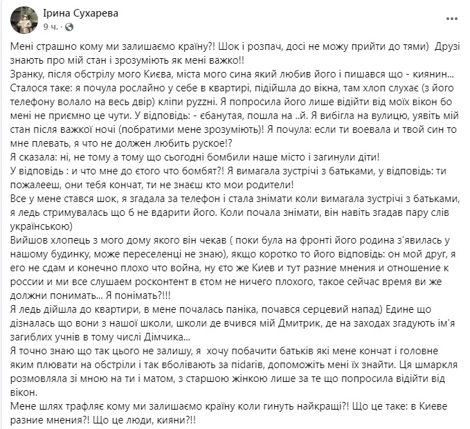 Как с сказано в посте, утром после обстрела Киева она услышала "русское дерьмо" прямо в своей квартире, подошла к окну и увдела, как под домом мальчик смотрит на телефоне музыкальный клип. Сухарева попросила его отойти от ее окон, потому что ей "неприятно это слышать". В ответ ребенок якобы назвал ее @банутой и послал на три буквы. Она выбежала на улицу и сообщила мальчику, что воевала сама, воевал её сын и он погиб. На что, по ее словам, ребенок ответил: "Если ты воевала и твой сын, то мне плевать. Я что, не должен любить русское?"