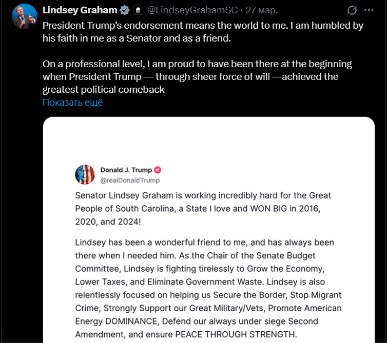 Сенатор-республиканец Линдси Грэм заявил, что Сенат США готов ввести вторичные санкции против РФ, если Россия не согласится на мир.
