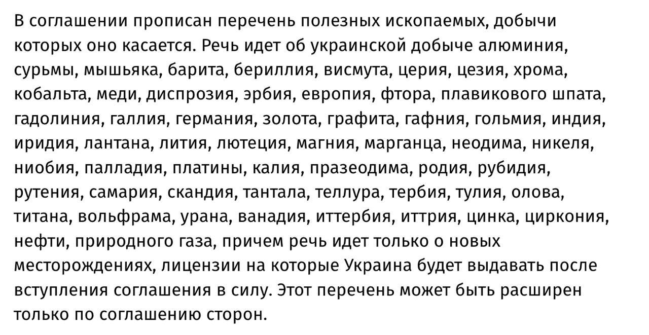 Однако соглашение не касается доходов от украинской инфраструктуры, как хотели США, а только 57 минералов (на скриншоте). Речь идет только о новых месторождениях, лицензии на которые Украина будет выдавать после вступления соглашения в силу.
