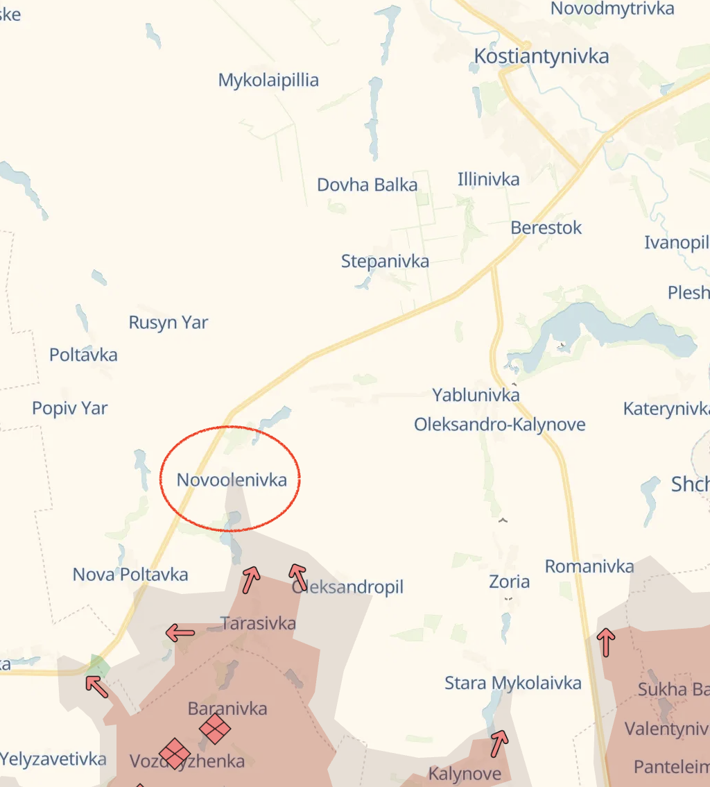 Россияне захватили Новоеленовку к югу от Константиновки, сообщил украинский военный с позывным "Мучной". Это село рядом с трассой в Константиновку из Покровска.