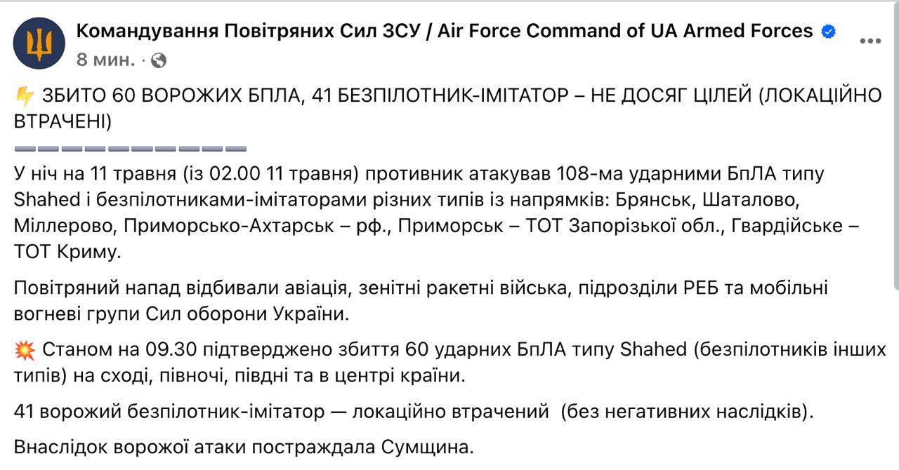 Россия впервые после перемирия атаковала Украину 108 беспилотниками. Сегодня ночью были сбиты 60 "Шахедов", еще 41 "локационно утрачен" без последствий.