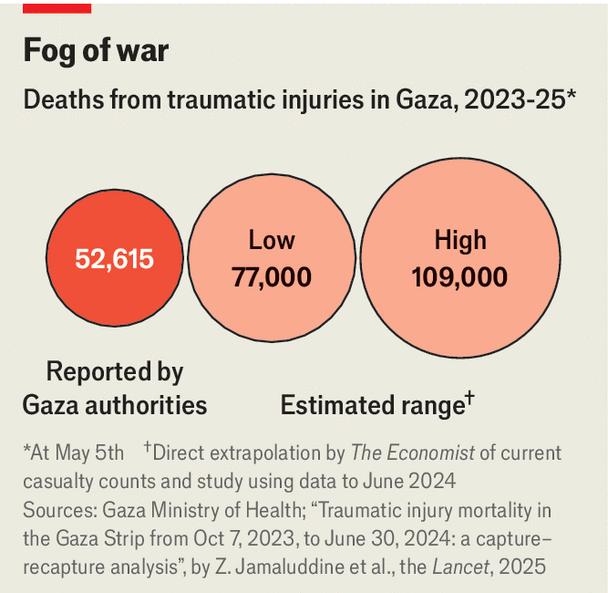 Такие данные приводит британский журнал The Economist на основании сопоставления трёх независимых списков погибших: от Министерства здравоохранения Газы, онлайн-опросов и некрологов в социальных сетях.