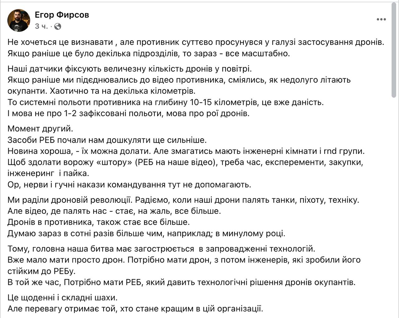 Также РФ развивается в использовании РЭБ, заглушая украинские дроны. Поэтому Фирсов призывает государство системно подойти к внедрению технологий и к поддержке работы украинских инженеров.