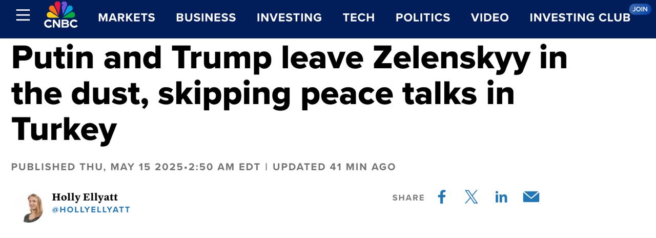 В то же время телеканал CNBC заявляет, что Путин и Трамп "оставляют Зеленского не у дел, проигнорировав мирные переговоры в Турции".