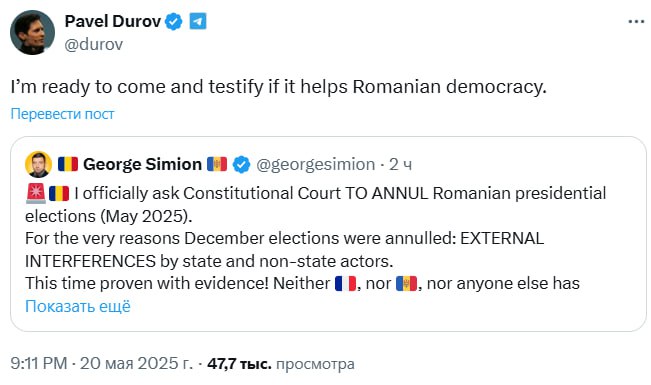 Дуров готов дать показания о вмешательстве Франции в президентские выборы Румынии, чтобы "помочь демократии"