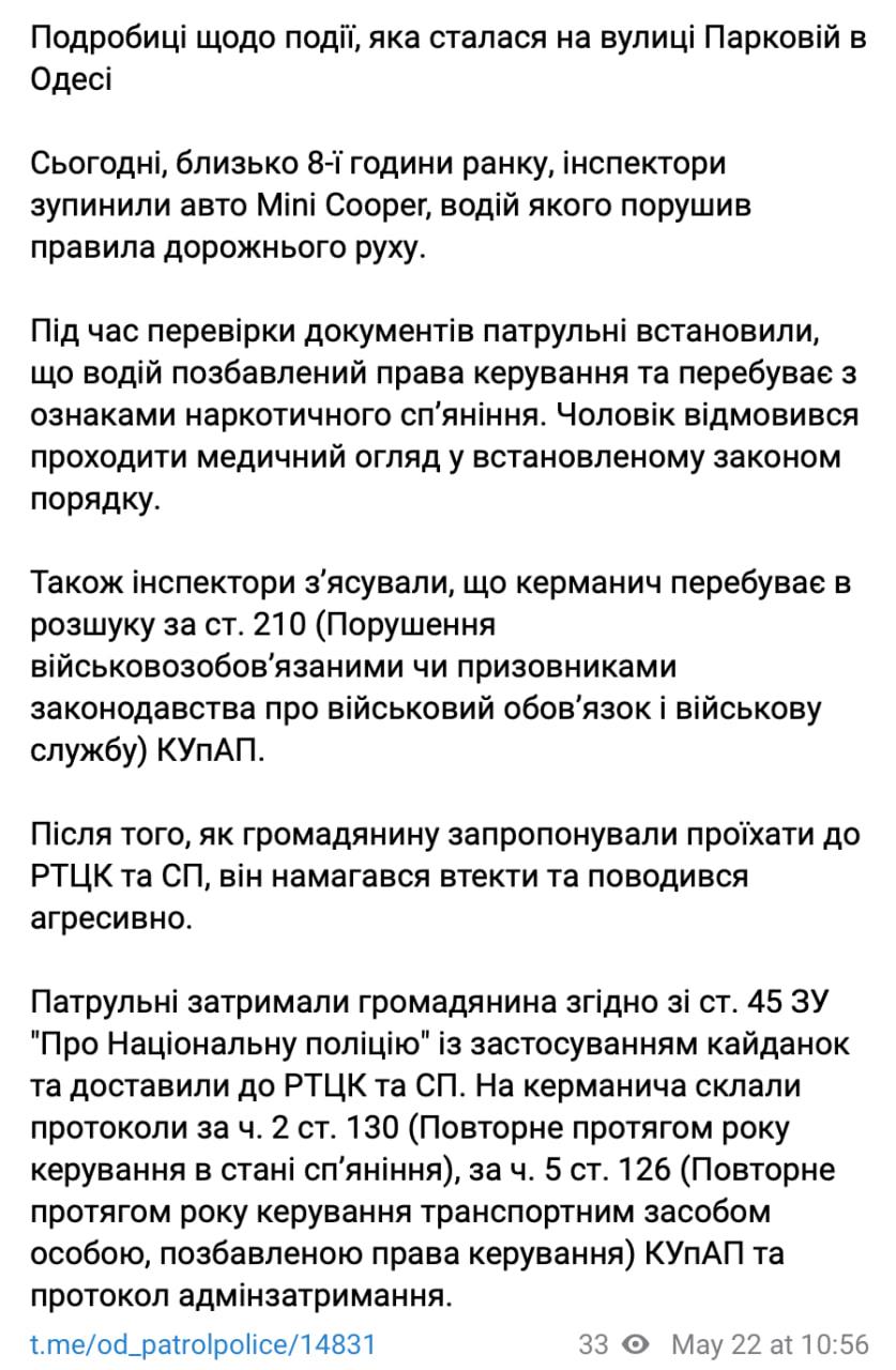 В местной полиции сообщили, что его авто остановили за нарушение ПДД и заподозрили, что мужчина под наркотиками. Также оказалось, что он в розыске ТЦК.