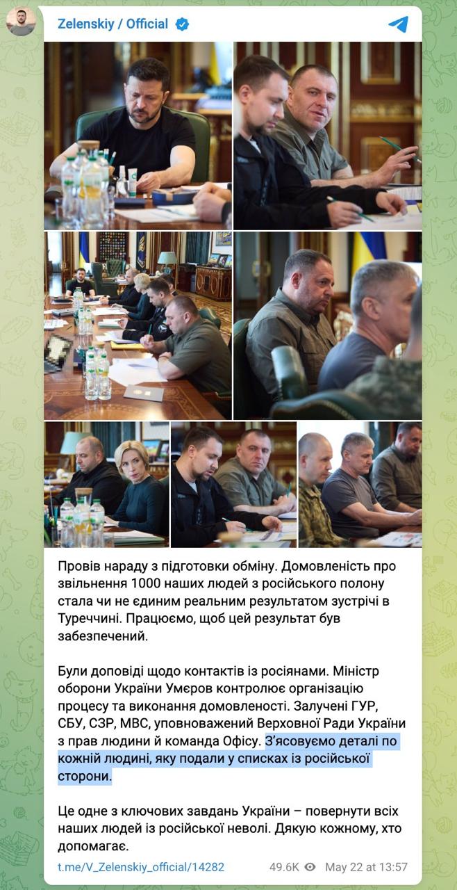 "Были доклады по контактам с россиянами. Министр обороны Украины Умеров контролирует организацию процесса и исполнение договоренности. Выясняем детали по каждому человеку, который был представлен в списках с российской стороны", - пишет президент.