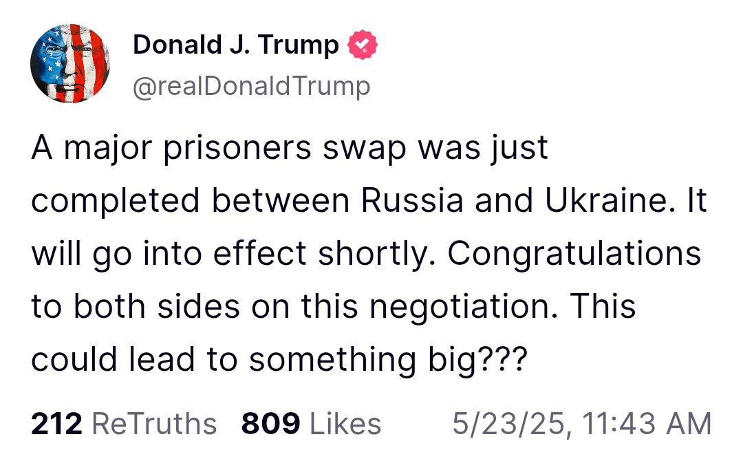 "Между Россией и Украиной только что состоялся крупный обмен пленными. Он вступит в силу в ближайшее время. Поздравляю обе стороны с достижением этой договорённости. Может ли это привести к чему-то большему?", - написал Трамп в своей соцсети.
