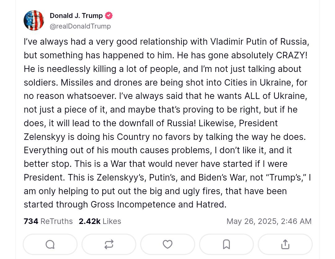 Это война, которая никогда бы не началась, если бы я был президентом. Это война Зеленского, Путина и Байдена, а не "Трампа". Я лишь стараюсь потушить большие и уродливые пожары, которые были разожжены из-за вопиющей некомпетентности и ненависти", - написал глава Белого дома.