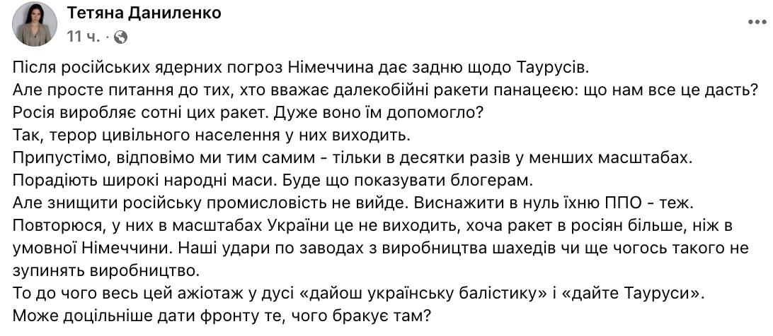 Она пишет, что Германия дала задний ход по поводу "Таурусов" "после российских ядерных угроз". При этом она не считает это оружие "панацеей".