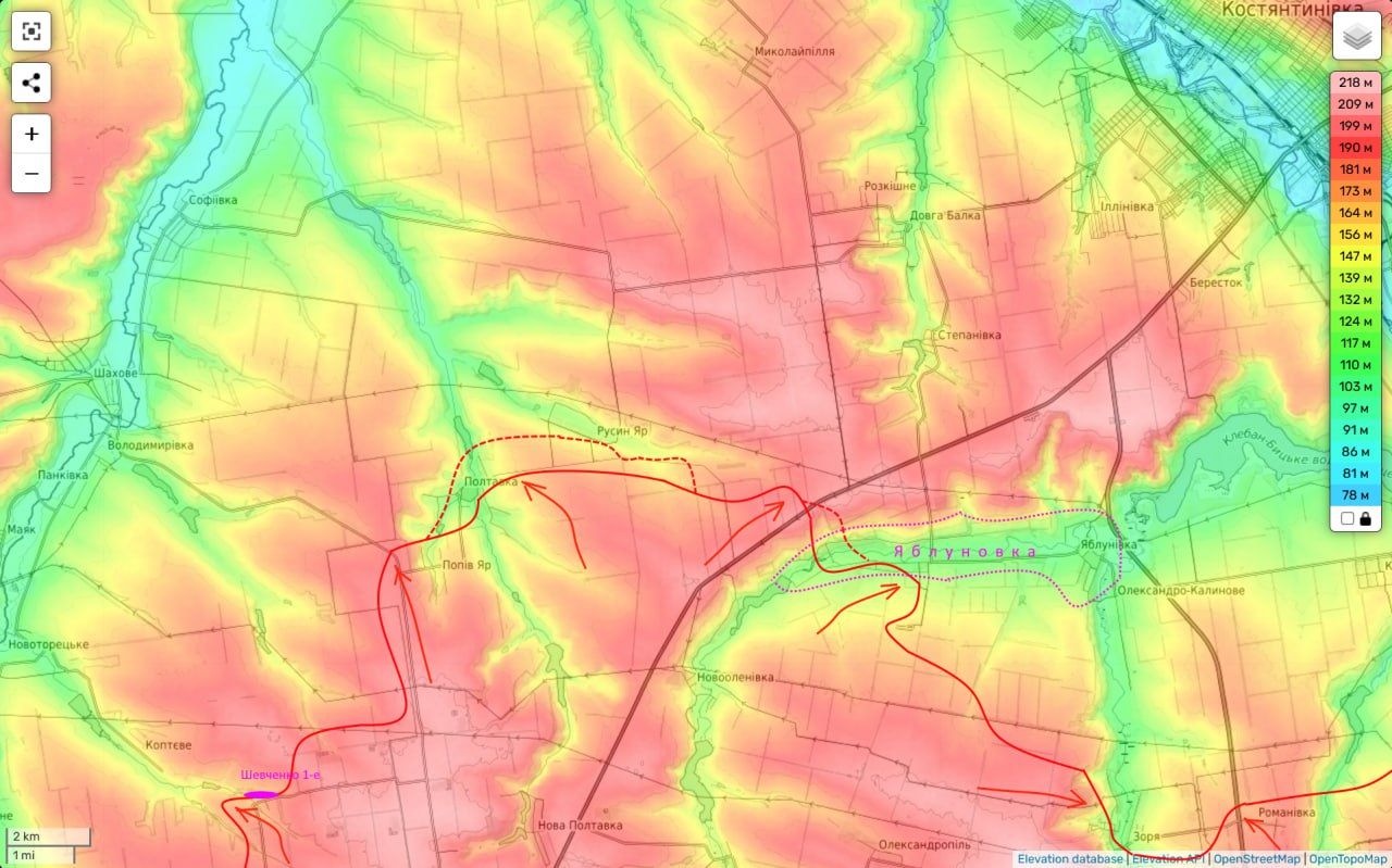 Российские военные паблики утверждают, что уже захватили Полтавку и штурмуют Русин Яр на северной части своего атакующего выступа. Восточнее бои идут в Яблоновке, а также остаточные столкновения в кармане южнее.