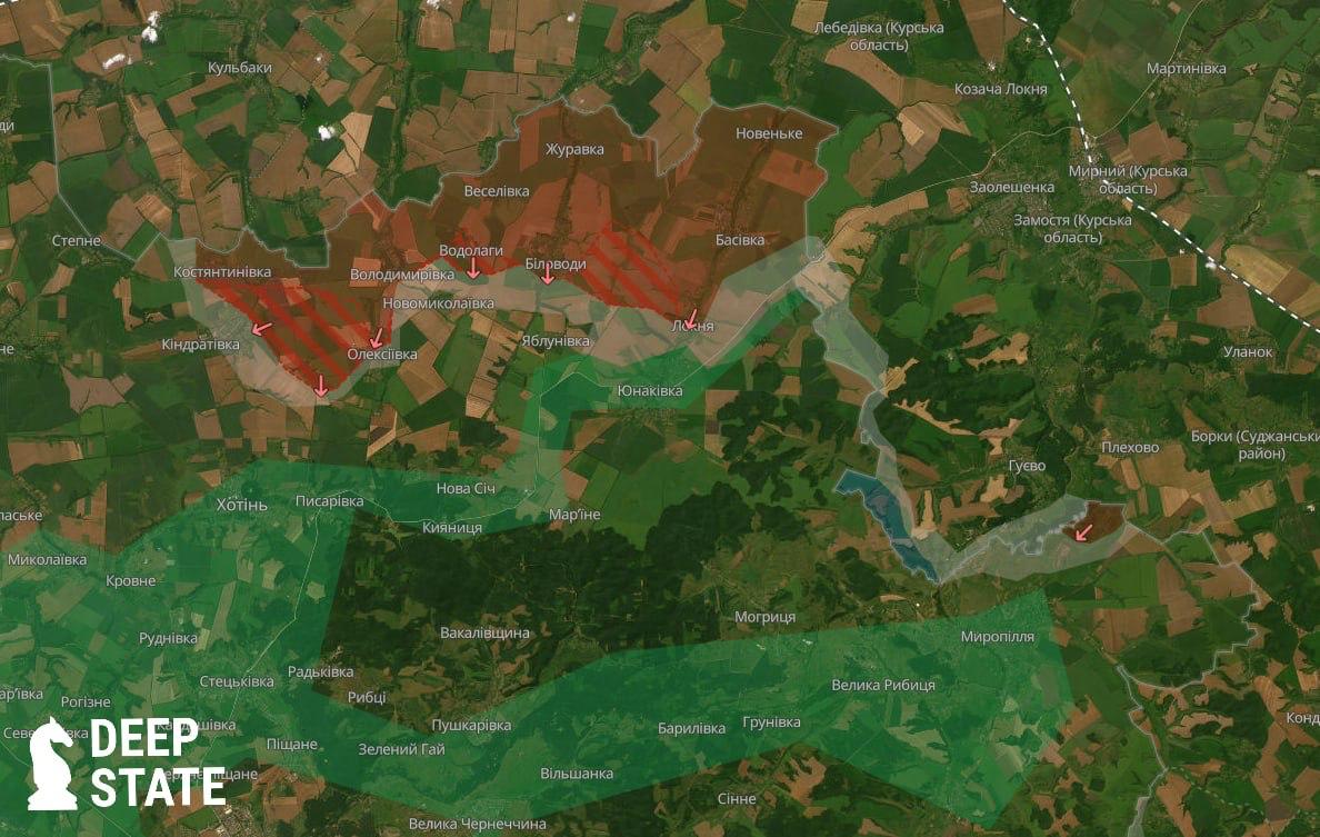 8.03 Россияне в Сумской области захватили села Андреевка и Водолаги, сообщает военный паблик Deep State. Продвинувшись также между Беловодами и Локней.