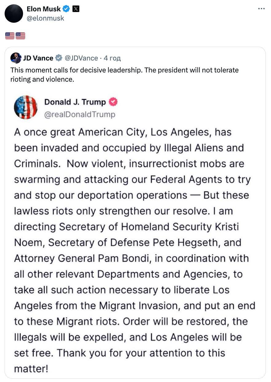 "Когда-то великий американский город Лос-Анджелес был захвачен и оккупирован нелегальными мигрантами и преступниками. Теперь же мятежные, агрессивные толпы атакуют наших федеральных агентов, пытаясь сорвать депортационные операции. Я поручаю предпринять все необходимые меры для освобождения Лос-Анджелеса от вторжения мигрантов и прекращения этих мигрантских бунтов. Порядок будет восстановлен, нелегалы будут изгнаны, а Лос-Анджелес станет свободным", - написал он.