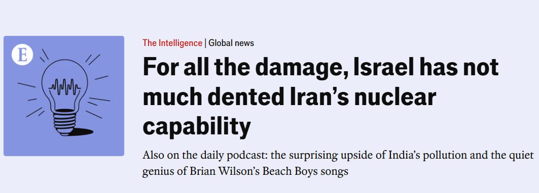 Издание сообщает, что израильские удары с 13 июня по ядерным и ракетным объектам Ирана пока затронули лишь треть инфраструктуры. Глубокие подземные ядерные центры, включая Фордо, остаются целыми – без американских "бункерных" бомб Израиль может не справиться.