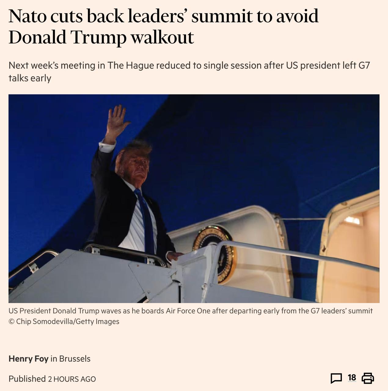 Из-за Трампа саммит НАТО на следующей неделе сократили до одной рабочей сессии длительностью два с половиной часа, чтобы президент США снова не уехал досрочно. Мировые лидеры встретятся в Гааге в рамках саммита Альянса в среду, а Зеленский примет участие в ужине во вторник вечером.