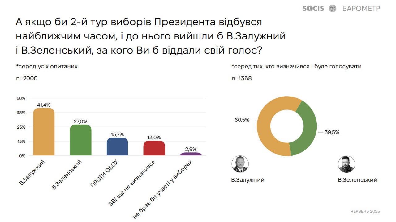 Во втором туре выборов президента Залужный выиграл бы у Зеленского - опрос