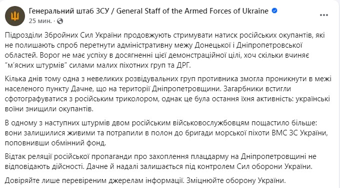 "Несколько дней назад одна из небольших разведывательных групп противника смогла проникнуть в пределы населенного пункта Дачное на территории Днепропетровщины. Захватчики успели сфотографироваться с российским триколором, однако это была последняя их активность: украинские воины уничтожили оккупантов. Реляции российской пропаганды о захвате плацдарма на Днепропетровщине не соответствуют действительности. Дачное и дальше остается под контролем Сил обороны Украины", - говорится в публикации.