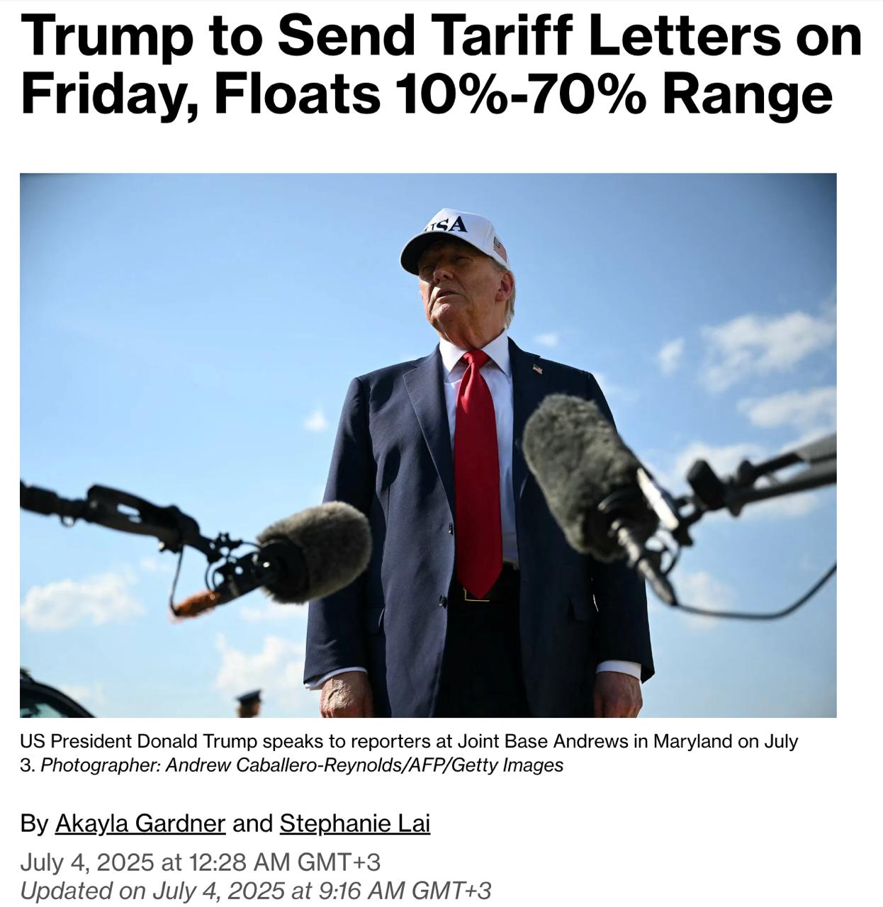 Как известно, 2 апреля Трамп ввел "взаимные" тарифы, но снизил их до 10% на 90 дней для переговоров. Затем он угрожал, что если страны не достигнут соглашений с США, он просто введет новые пошлины.