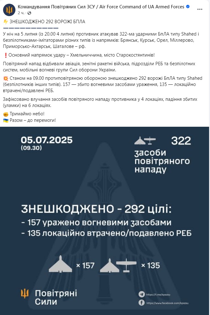 12:52 Воздушные силы ВСУ заявляют, что этой ночью сбили 292 из 322 российских БпЛА, которые атаковали Украину.