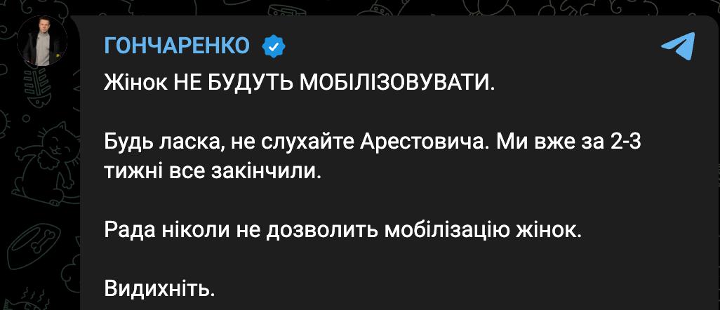 Арестович считает, что вопрос о мобилизации женщин могут поднять осенью. Гончаренко заявил, что "Рада не позволит"