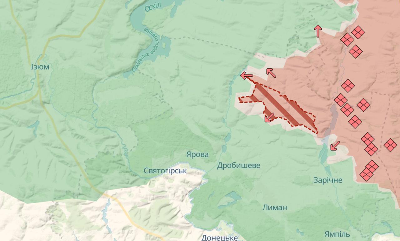 Армия РФ существенно продвинулась в направлении Святогорска и Лимана, свидетельствует карта Deep State. Продвижение произошло широким фронтам по линии сел Карповка, Зеленая Долина и Колодязи. Отметим, что на этом участке еще недавно контратаковали украинские войска, однако существенно продвинуться не смогли и сейчас, судя по всему, инициативу вновь перехватили россияне.