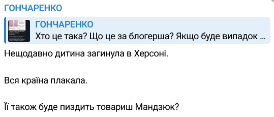 "Недавно ребёнок погиб в Херсоне. Вся страна плакала. Его тоже будет пи@дить товарищ Мандзюк?" - написал он в своем телеграм-канале.