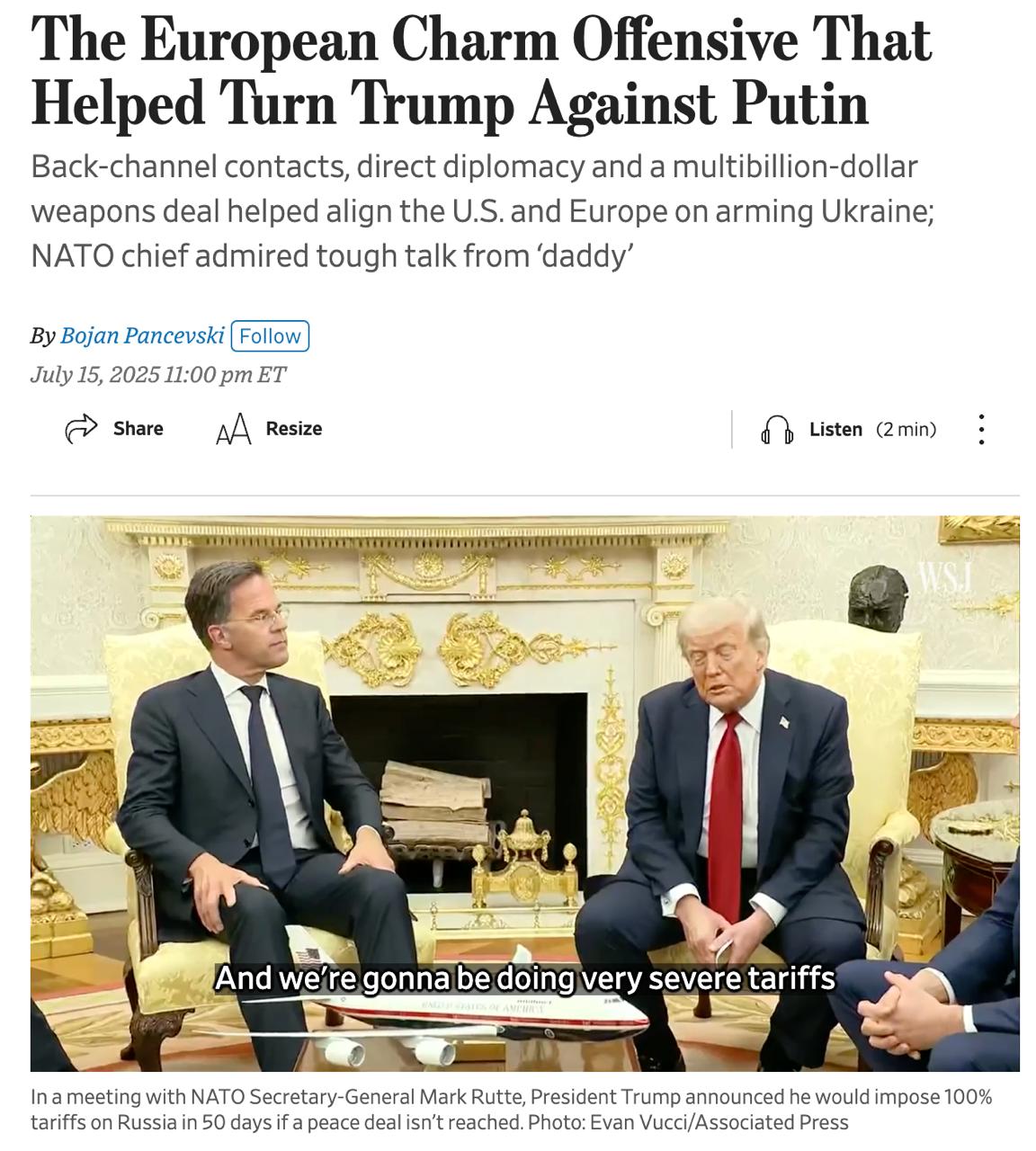 Президент США набрал канцлера ФРГ Фридриха Мерца поздно вечером 11 июля после просмотра кадров российских авиаударов по украинским городам, чтобы выразить недовольство Владимиром Путиным. Мерц понял, что терпение Трампа закончилось, и он готов принять его предложение - использовать немецкие средства для закупки американского оружия для Украины.
