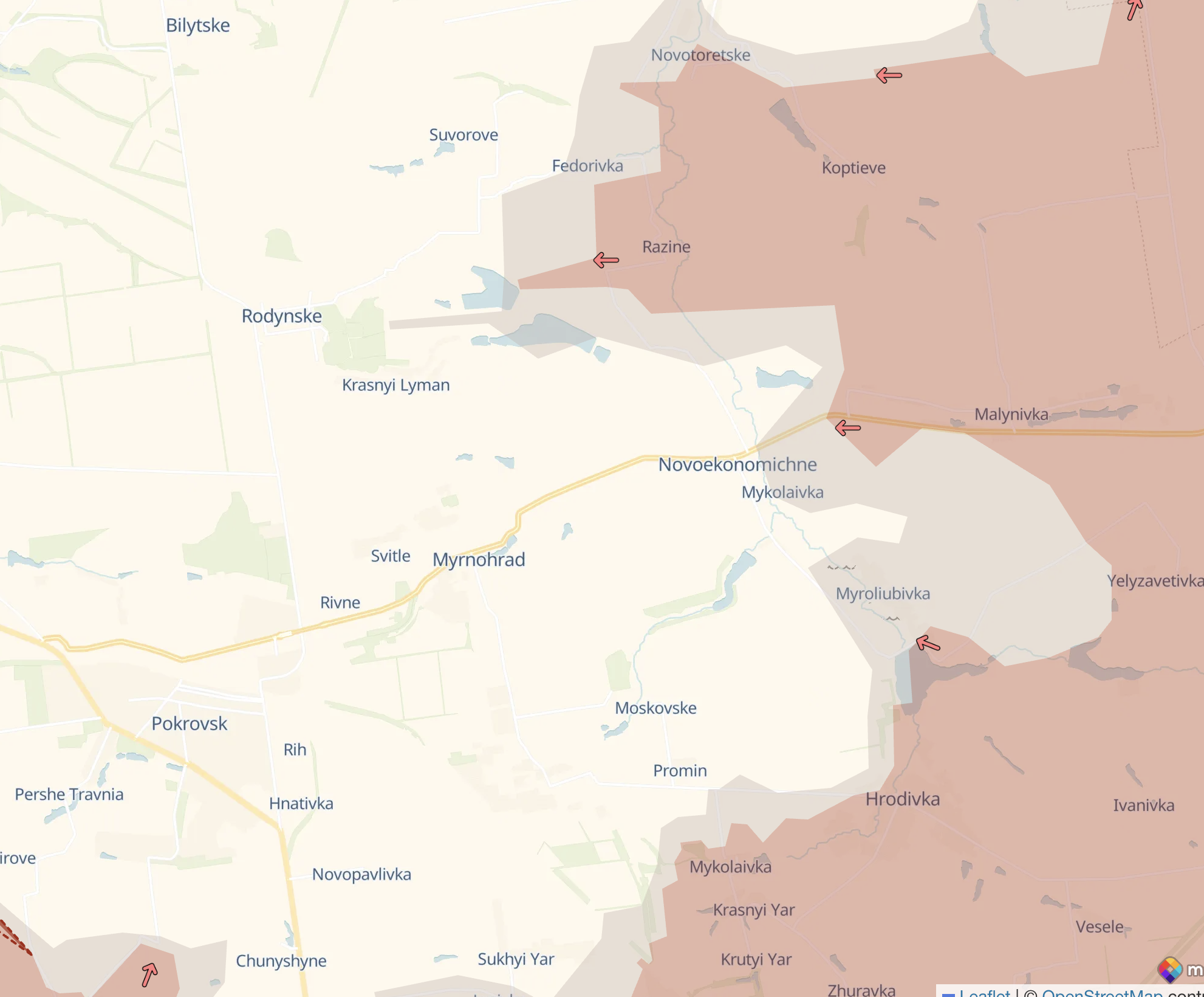 О том, что ситуация здесь критическая, сообщает и украинский военный обозреватель Богдан Мирошников. Он указывает на быстрое продвижение РФ к Родинскому - ключевому городу к северу от Покровска и Мирнограда.