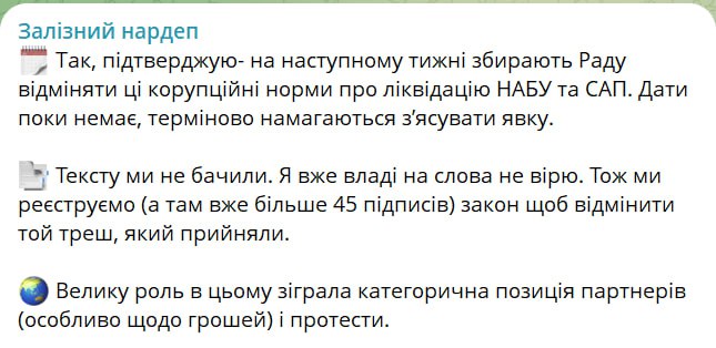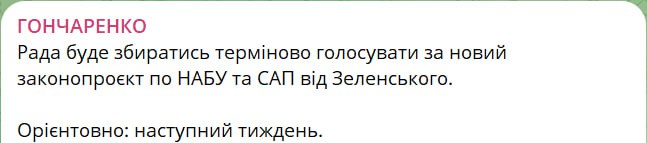 Между тем нардеп из "Европейской солидарности" Алексей Гончаренко написал в своем телеграм-канале, что парламент соберется, чтобы срочно голосовать за новый законопроект о НАБУ и САП от Зеленского. Ориентировочно это произойдет на следующей неделе.