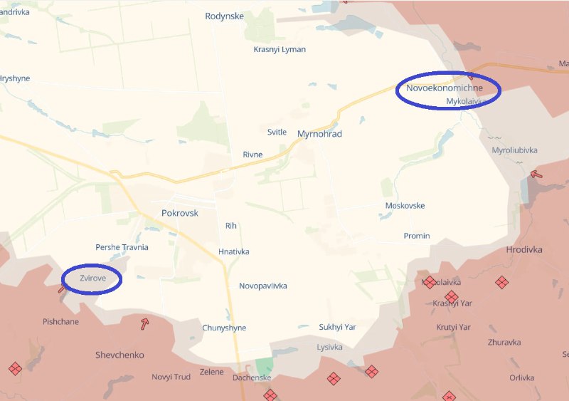 Новоэкономическое находится на восточных подступах к Мирнограду, а Зверево - к юго-западу от Покровска. На карте Deep State оба населенных пункта находятся в серой зоне.