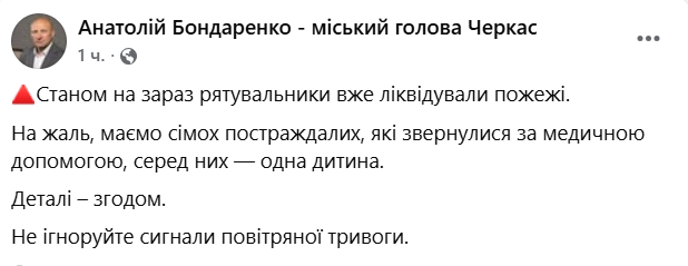 08:10 Ночью россияне нанесли ракетный удар по Черкассам. Семь пострадавших, которые обратились за медицинской помощью, в том числе один ребенок, сообщает мэр города Анатолий Бондаренко.