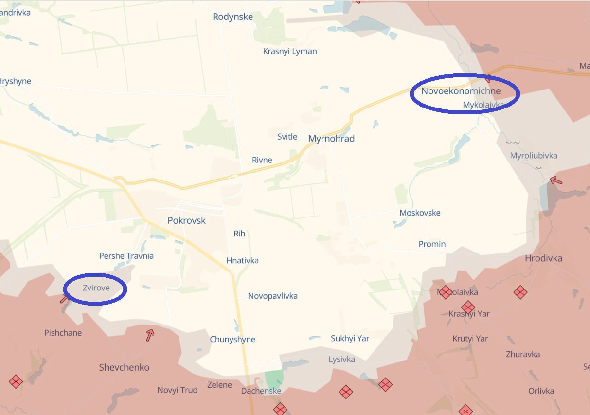 На Покровском направлении минобороны РФ заявляет о захвате российской армией Новоэкономического и Зверево. Новоэкономическое находится на восточных подступах к Мирнограду, а Зверево к юго-западу от Покровска.