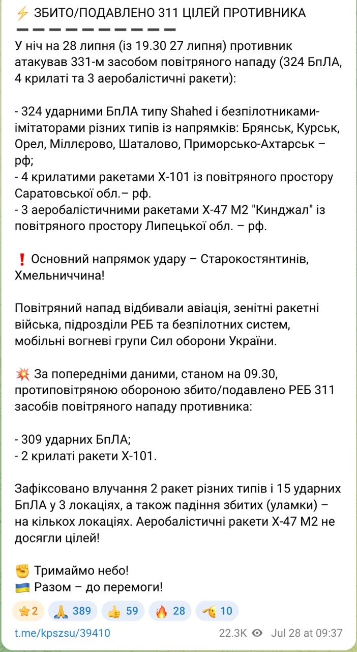 Сбить\подавить удалось 309 дронов (Шахеды и имитаторы) из 324, две ракеты Х-101 из четырех. Не удалось сбить все 3 "Кинжала", но заявлено, что они "не достигли целей".