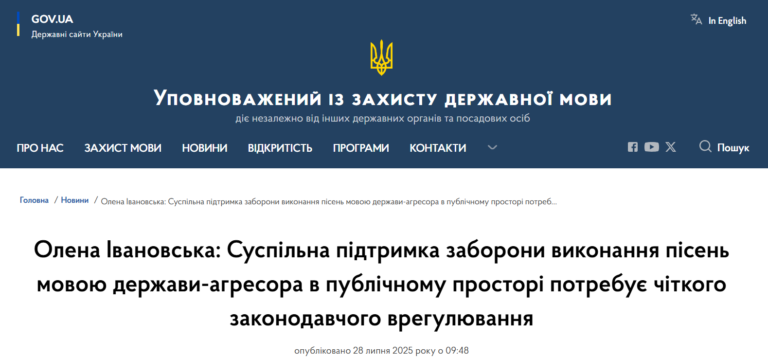Поэтому "общественная поддержка запрета исполнения песен на языке государства-агрессора в публичном пространстве требует четкого законодательного регулирования", отметила омбудсмен.