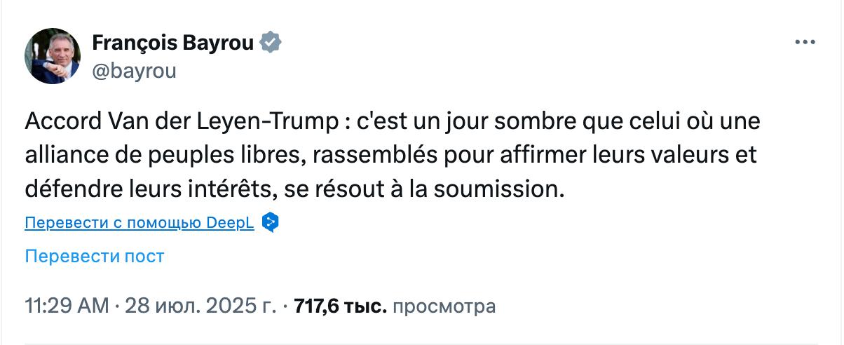 Премьер-министр Франции Франсуа Байру раскритиковал торговое соглашение между Европейским союзом и США.