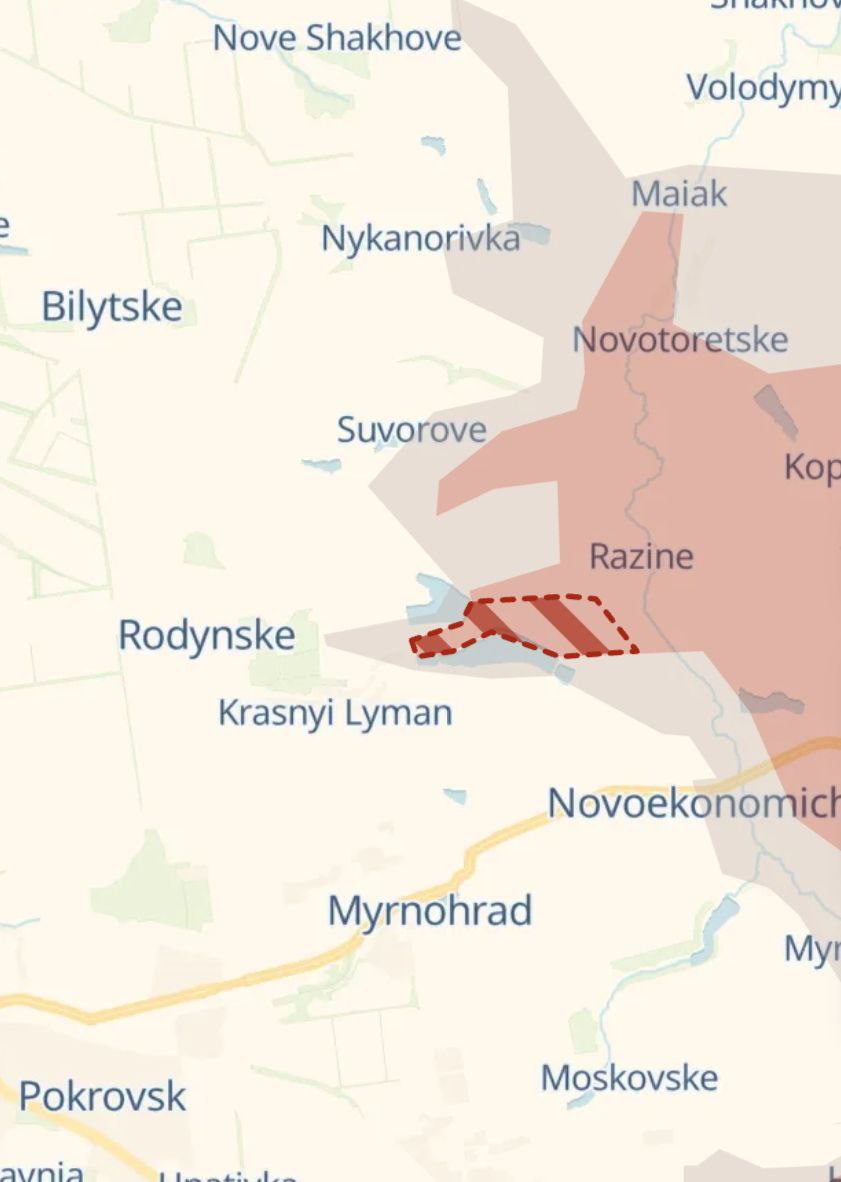 Войска РФ продвинулись к северу от Мирнограда в сторону Родинского. А также к югу от Константиновки - у Яблоновки и Александро-Калиново (в РФ говорят, что оба села захвачены).
