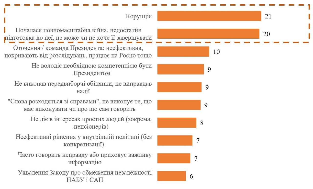 Главной причиной недоверия респонденты назвали коррупцию (21%), на втором месте причины, связанные с войной: началась война, недостаточная подготовка к ней, не может или не хочет ее завершать (20%).